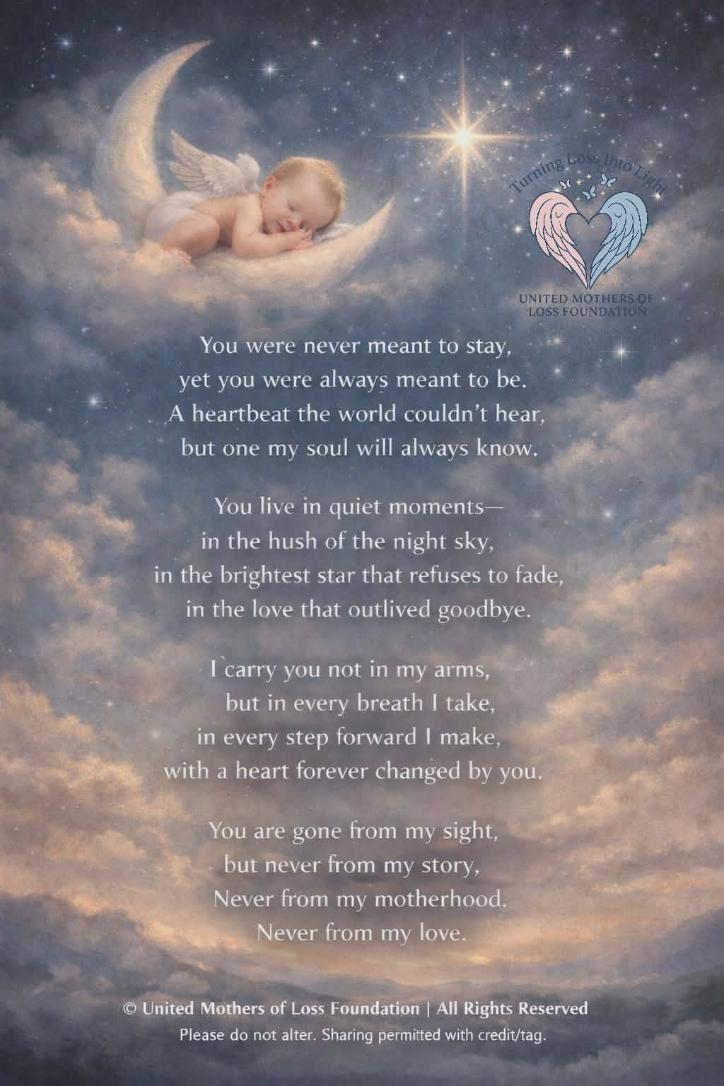 Our mission is to turn loss into light by providing compassionate support, memorial resources, community, and advocacy for grieving mothers and families. We are dedicated to honoring every baby’s life, no matter how brief, and to making sure every family has access to support during and after loss.